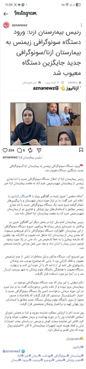 🔸 واکنش رئیس بیمارستان به خبرسازی درباره خروج دستگاه سونوگرافی